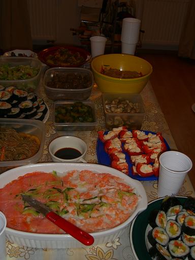 Meine Freundin aus Korea hat Korianisches Sushi,gebratene Nudeln und Kimuchi gekocht. Und ich habe Japanisches Sushi ,Hackfleischbällchen und etwas gemacht. Alles war total lecker !! Nächster Morgen hat miene Freundin mir gesagt,Ganze Zeit,ja ohne unterbrechung hast du gegessen........... Ja ,es stimmt.....aber schäme ich mich.