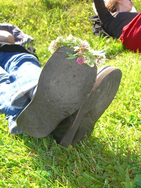 シロツメグサが咲いてたので花輪を作った。右足と左足の結婚式だ♡