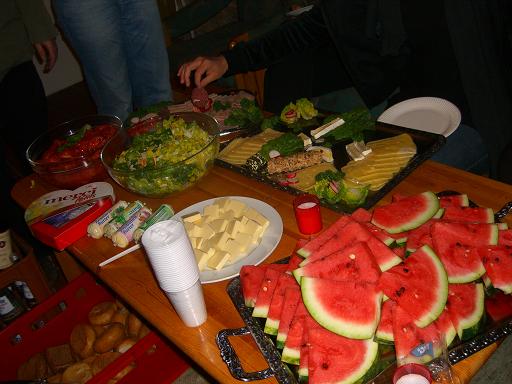 夜の11時くらいから計画していたグリルパーティーを開催。でも外が寒くて、皆長ズボンにコート姿。でもスイカなんか用意しているあたり、日本みたい。日本の夏の合宿とか、『これー家でとれたものなんですぅ』とか言ってもってくる人いるやん?適度に飲んで、お肉食べて、満腹満腹。