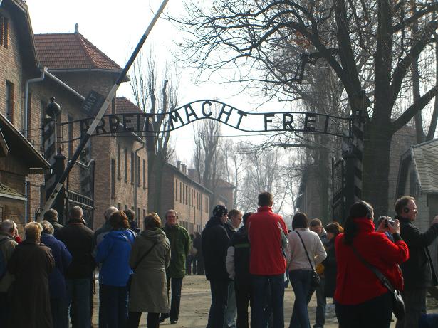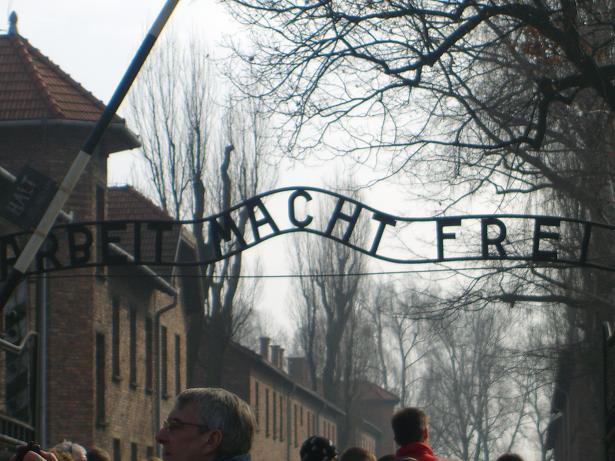 死の門と言われる“Arbeit macht frei”の文字が掲げられた収容所への入り口。意味:働けば自由になる。