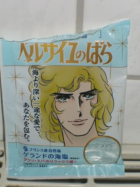 フェルゼン入浴剤(フェルゼンとは? マリー・アントワネットと恋仲にあったスウェーデン貴族。オスカルも一時彼に恋をしてた)キャッチフレーズは『海より深い一途な愛であなたを包む』です。それにちなんでこのすっごい青色なのか・・・。溺れそうだよ。あなたの深い愛に。もしかしてうちの湯船は水深20Mくらいあったっけ?っていうくらいに底が見えない。タラソの湯。フランス産の海塩を使用。海の塩ってことで何かしら爽やか度をあげようとしている気がする。物語中でも始終爽やかだったよなぁ・・・・。