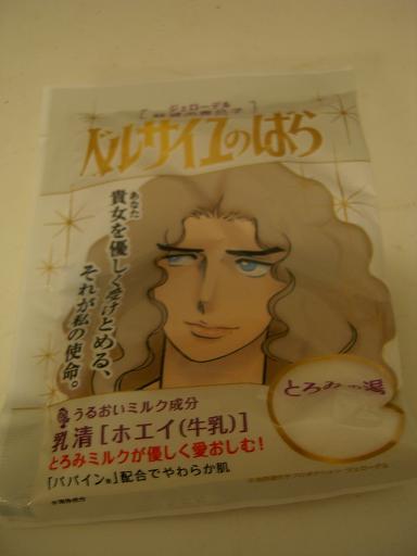 ジェローデル入浴剤。(ジェローデルとは? オスカルに求婚するも、オスカルのアンドレへの想いを知って清く身を引く。ベルバラの主要男性キャラにオスカル様を入れないと、この人が出てくるのか!!)乳白色の入浴剤でヨーグルトの香り。キャッチフレーズは『貴女を優しく受け止める、それが私の使命』←そんな使命感をお持ちでしたか!? これ、何かぬるぬるしてて、まあ、とろみの湯という入浴剤なのだがそのぬるぬるが溶けるまで10分かかります、と書いてある。何かぬるぬるって清い感じぢゃないぜ、ジェローデル・・・。何か後をひく感じだよ。しかし肌はツルツルになる気がする。優しさとぬるぬるさはどう関係があるんやろう???キャラは好きぢゃないけど匂いは好き。