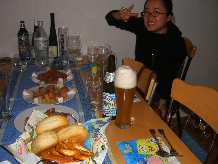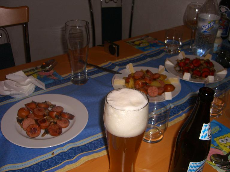 ムルナウでの醍醐味は何といっても自分達で食事を作れるということ!!5人もいるといっぱい作ってももすぐ消えちゃうからふ・し・ぎ☆いろいろ買って、調理したこの日のメニューは・・・ソーセージの炒め物(笑)ドイツのソーセージを皆に食べさせてあげたいというP子の願いだったが、フライパンではうまく焼けず(こっちの人はグリル使うもんね。私はいつもトースターでやるけど)切ってまんべんなく火を通しました。バイエルンに来たんだからGanmoはビール、(Hefeweizenだけど)をちゃーんと買いましたよ。そうそう。G姉妹・姉のMoiさんは12月生まれやったんです。なので皆でお祝いしました☆おめでとぉ★☆ケーキじゃなくってチョコでお祝いだったね。