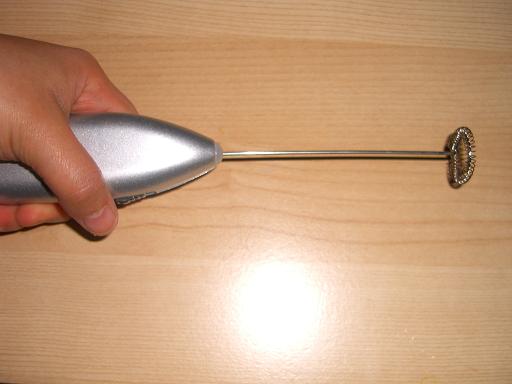 じゃじゃーん、と取り出しました、あわ立て器。この+→― という意味不明な記号に頭を悩まし、蓋を開けて乾電池を一個だけいれてみたり、単四を2つ入れてみたり・・・試行錯誤の末、単3電池2個が正しかったのだが、電池が2つも入りそうな空間やないよね、これ!?
