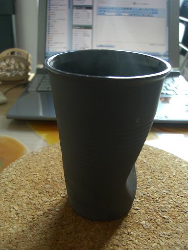 こちらは私の新しいカップ。こっちではよく見かける自販機のプラスティックコップを模したもの。潰れている感じが良くて購入。誰かのお土産用に買ってたんやけど、上写真のカプチーノのカップをその後、垂直に落とした。幸い底の縁だけが割れて、まだ使えそうやったやが、こっちを出してみた。あのカップは大好きな豹(猫らしいが私には豹に見える)なのでまた買いなおそうかな・・・フランクフルトの猫ショップに売ってるからちと遠いが。
