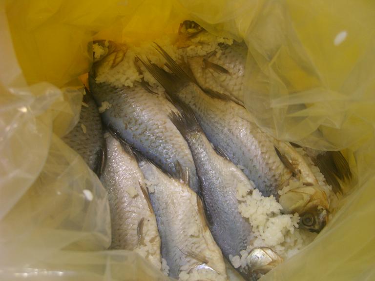 漬け終わってから『ちょっと塩加減強すぎたんちゃうか』との感想。何でも、塩がきつすぎると醗酵するとき汚水のような臭いを発するのであるという。いや、いつもそんな臭いやんか、と思う私だが、フナズシ研究家が言うのだから少し不味かったか、と反省をするも、今更反省しても塩は溶けて抽出なんてできない。あたし知ーらない。