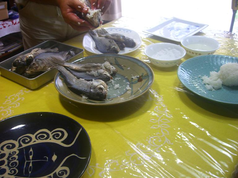 私が手伝うのは魚に詰めるご飯用に塩おにぎりを握ること。このおにぎりの大きさを私の手の大きさを無視したドでかいサイズを要求してきたのでブツブツいいながら仕事開始。父は慣れてるので素早く魚にご飯を詰めていく。ご飯は魚のエラから詰めていくので見るとちょっと息が詰まる思い。詰められた魚は樽に並べられ、重しをされて冬まで醗酵させる。