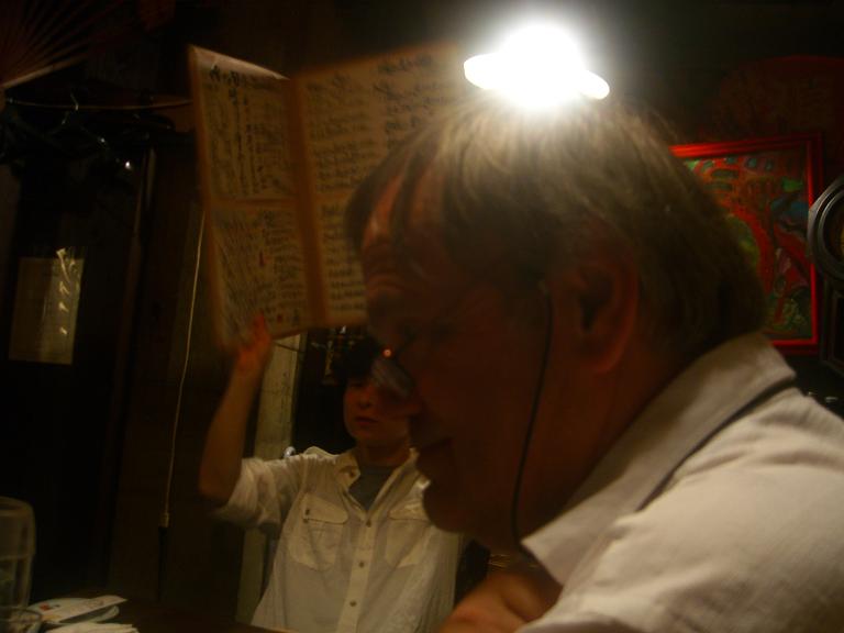 居酒屋で焼酎飲み比べ◎ ライトが当たって河童みたいになった三男さん