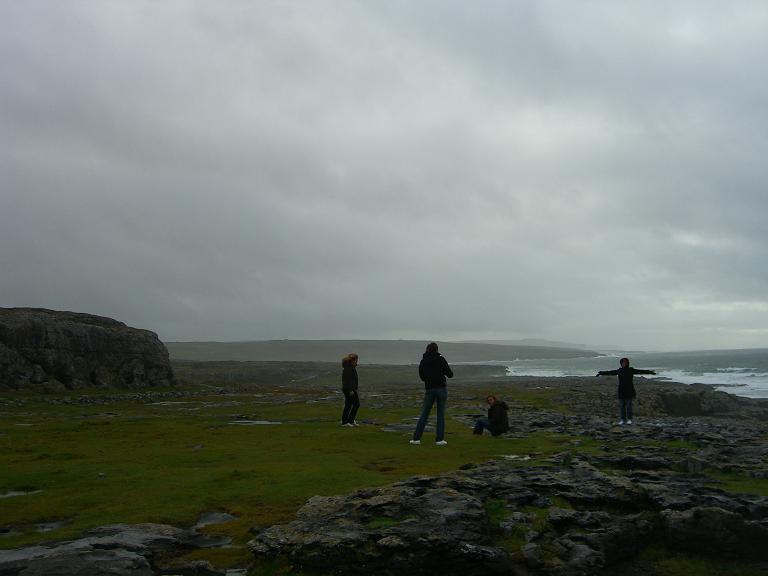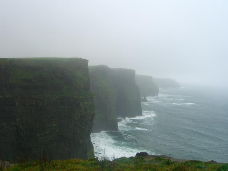 通り過ぎる建物をガイドさんが説明してくれるんやけど訳解らず。そんなこんなでツアーのハイライト、モハーの断崖に到着!!Ganmoは海が好きだがあんまり見た事が無い。断崖絶壁なんてのを見るのもこの日が始めてだった。それにしてもすごく高い!!風が強い!!傘を差したらマジで飛んでいきそうだったので塩に濡れ、S’sと二人飛ばされそうになる。昼にも関係なく雪が降ってきた!!と思ったら塩の華だった。ってか、この寒いのに春の服、あ、いやいや、夏の服を着ている奴がいた!!おいおい!!寒いだろ!!