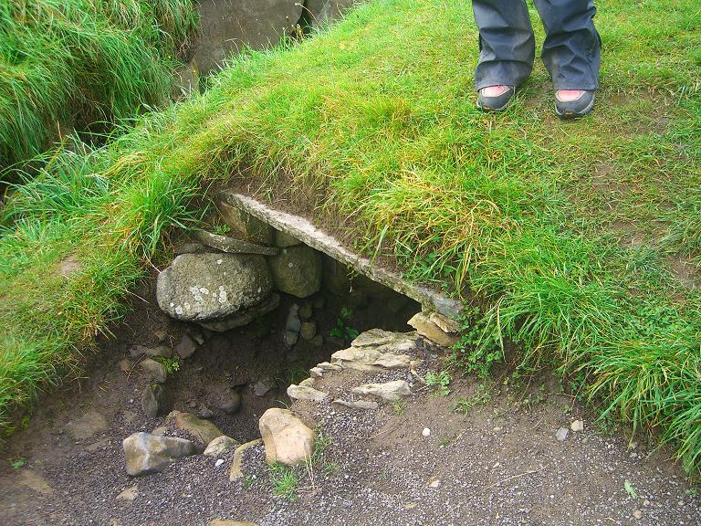 上のでっかい墓は冬至の日の光が射し込んでくる。実際に中を真っ暗にしてライトを照らして見せてくれる。右の写真は入り口。不思議なうずまきが刻まれた石がある。