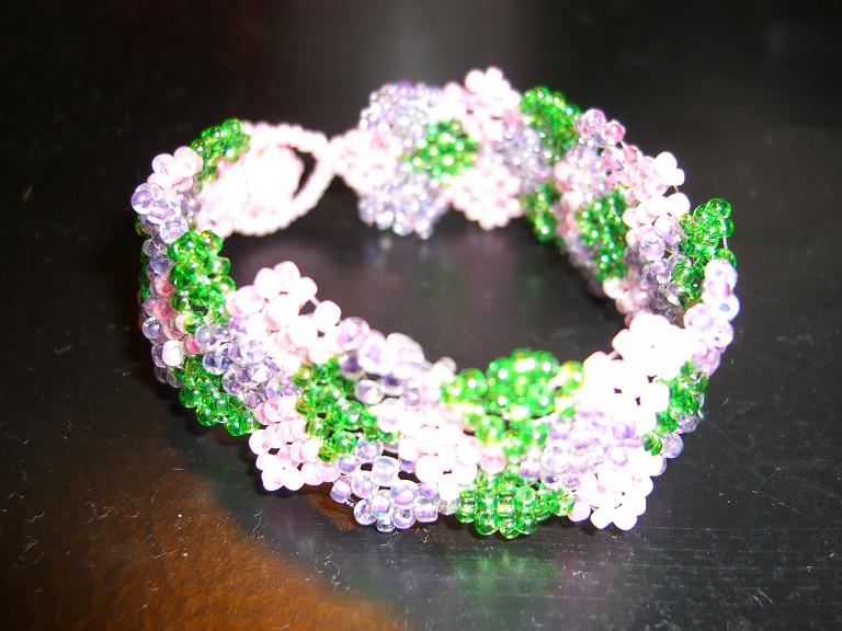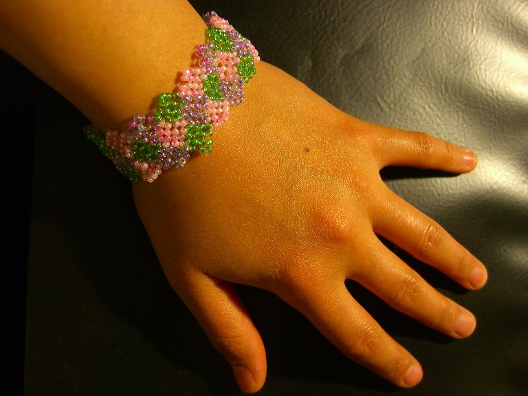 左のは、薄いピンクパール、透明紫、キラキラ緑、でひし形の◆◇◆◇を3本作って繋ぎ合わせました。余ってた丸小ビーズで作ったから、数が合うか冷や冷やものでした。