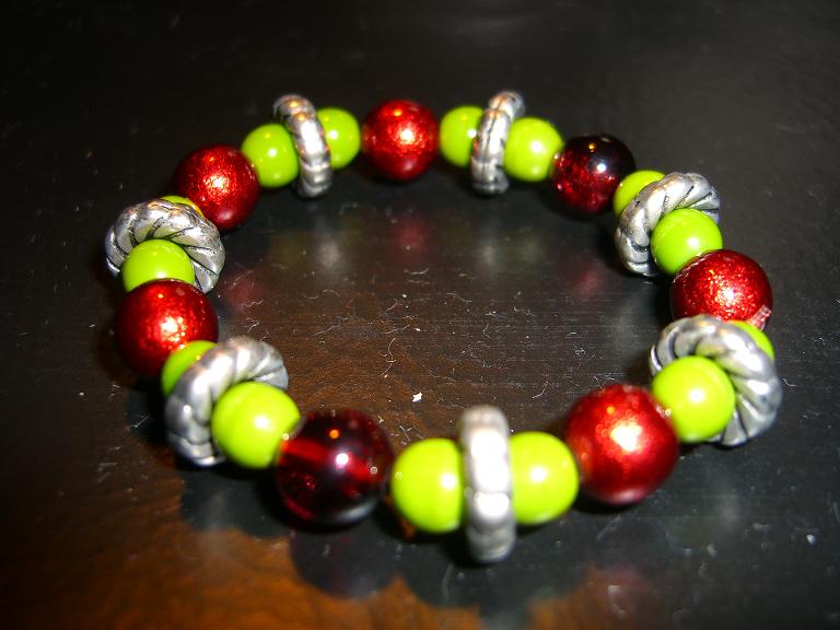 右のはちょっと虫みたいなかんじ。ビーズ屋さんで『緑と赤のブレスが作りたいんです』って言ったら見つけてくれた緑のビーズ。赤いビーズはなんだか銀紙に包まれたチョコレートみたい。