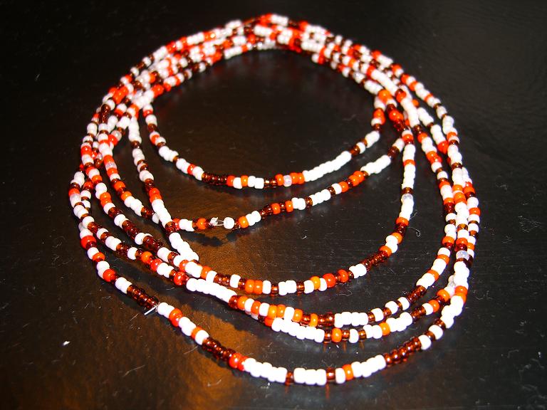 もうあんまり使わなくなった丸小ビーズを色分けして繋ぎ合わせただけのネックレス&ブレスのダブル2Wayアクセ。私の場合、ネックレスだと3連。手首だと8連になる・・・・