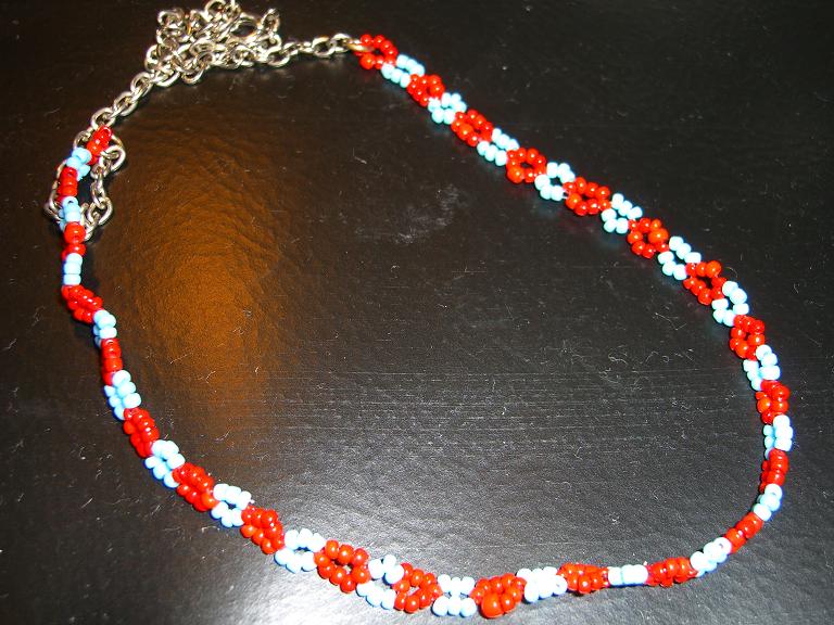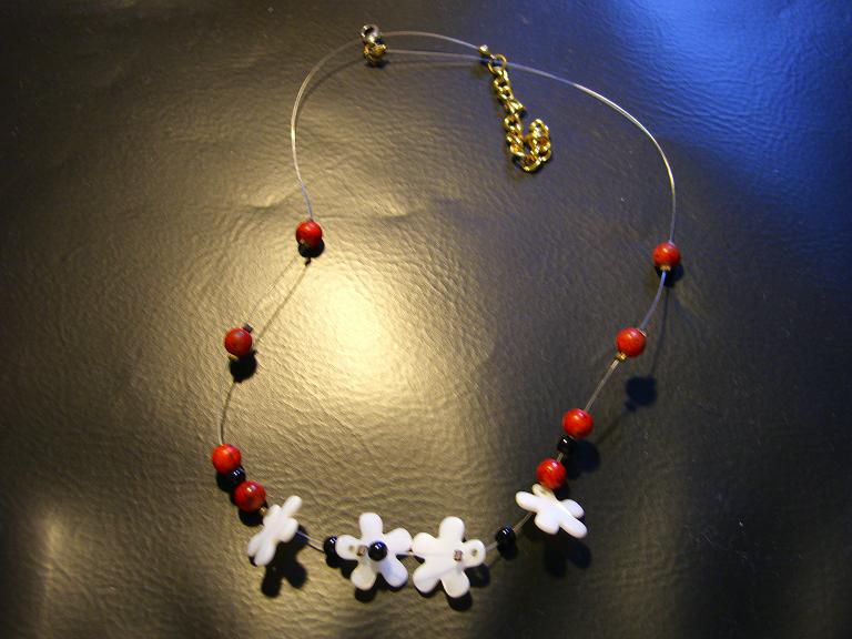 これは夏に先輩と作ったネックレス。花形シェルビーズが気に入って購入。赤と黒のビーズ(なんだかGanmoの趣味がわかるような・・・)留め金、潰し玉に金色を使用。この赤のビーズ、写真ではわかりにくいかもしれないけど、黒い点々模様入り。そう、赤いうずら卵みたいなかんじ。夏によく着用してた為、垢がついたり、汗で金具がハゲたりしてもた・・・
