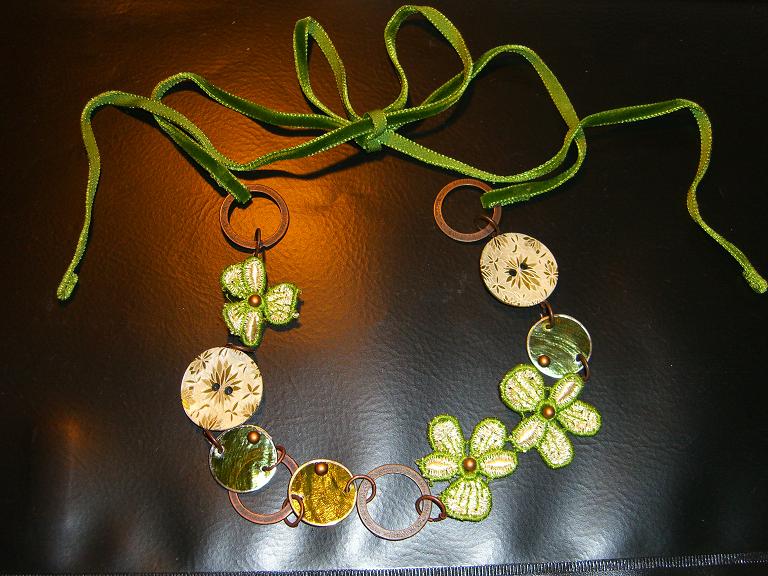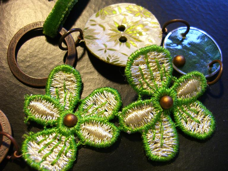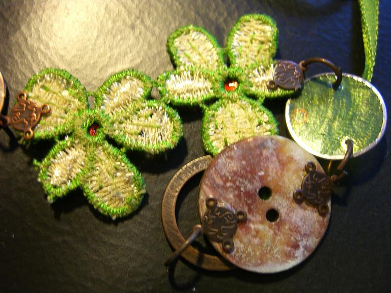 クローバーだと思って購入して、よくみたら花だった、というオチ。これもビーズ屋さんで見たアイデアをパクリました。元はパーツの数がこれより各2個ほど多い、かな。でも私には長さはこれで十分。うーん。小さいって便利(泣)この緑の花のはもともとリボン。それを切って裏の金具を貼り付け、繋いでます。緑の丸いパーツは、中がガラスか何か薄いものでできているので、丸カンを閉じた隙間に入り込んで割れてしまいます。一部割っちゃったんですが、それを防止する為、不細工になりますが、丸カンを閉じるときにちゃんと閉じずに上へ重ねるようにしてます