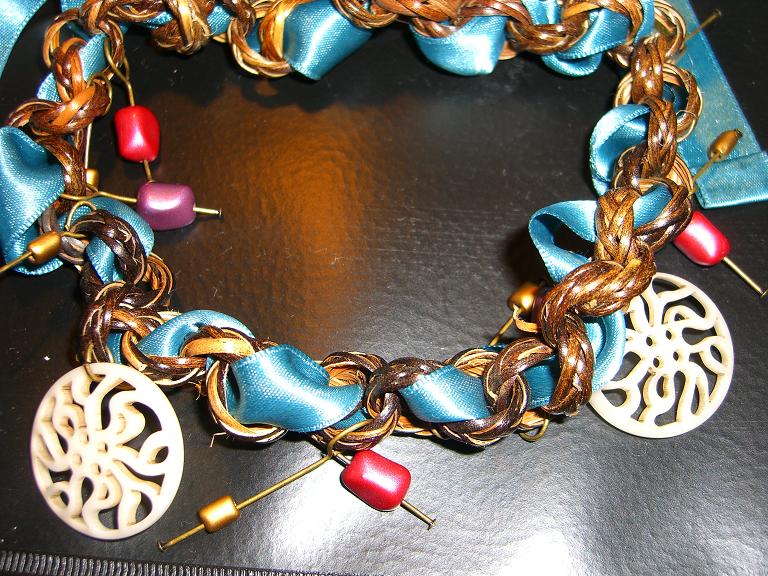 この木の鎖+リボン、という組み合わせはビーズ屋さんの展示品にあったアイデアを拝借。本当はもっとジャラジャラと大きいボタンを付けたかったけど予算が無く、白い大きな丸いパーツ、赤、紫、金色の飴ちゃんみたいなビーズをTピンでぶら下げました。涼しそうな色が夏、秋共にいけそう。