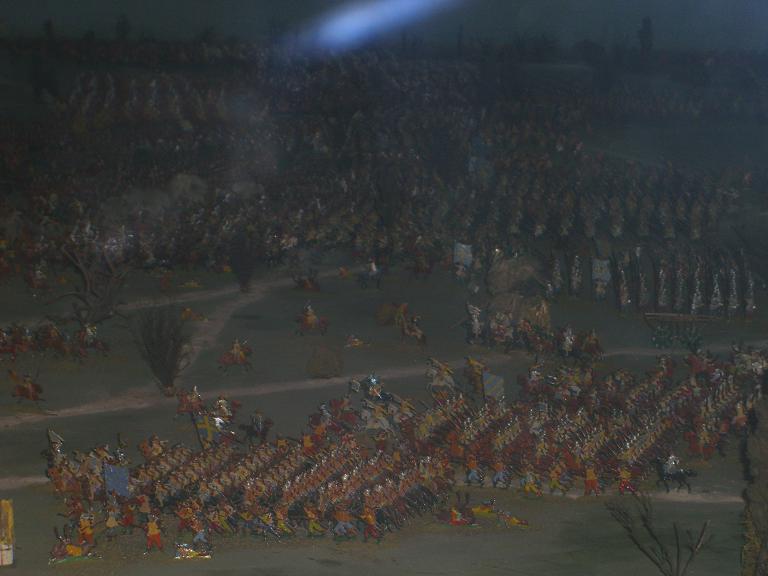 ジオラマで再現された戦の風景。30年戦争はプロテスタントとカトリック派の争いで、神聖ローマ帝国(昔のドイツ)が主な戦地となっている。後年、宗教戦争でなく、各国の権力争いに発展していった。参戦したスウェーデンの王、グスタフ・アドルフはこの近くで戦死している。右の写真は野営の再現。