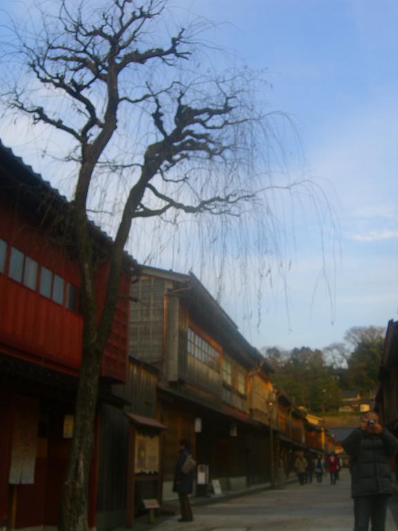 金沢の遊郭みたいなところ。今は観光客向けのお店が立ち並ぶ。しだれ柳(葉っぱがないけどたぶんそうだろう)がやっぱり立っていた。