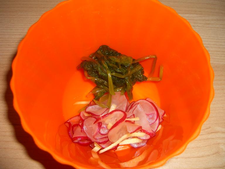 ラディッシュの生姜付けとその葉っぱのお漬物。他、ラディッシュはべったら漬けにもしました。おいしいー。
