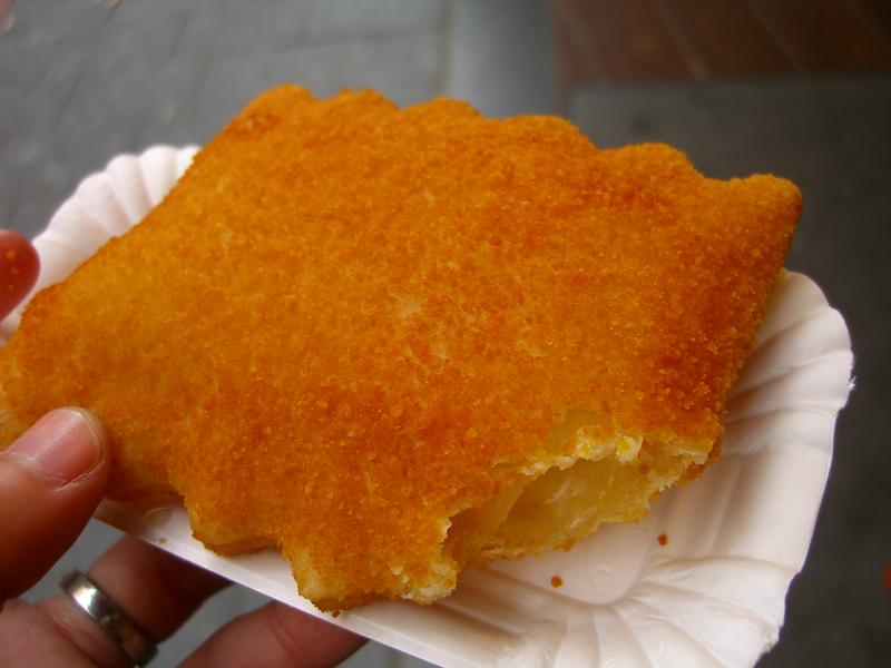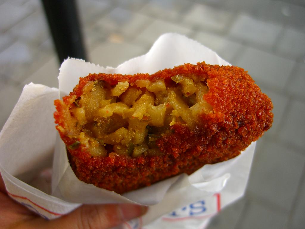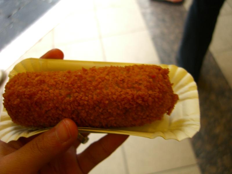 チェーン店のFEBOで長細いクリームコロッケと、チーズたっぷりの包み揚げ。
